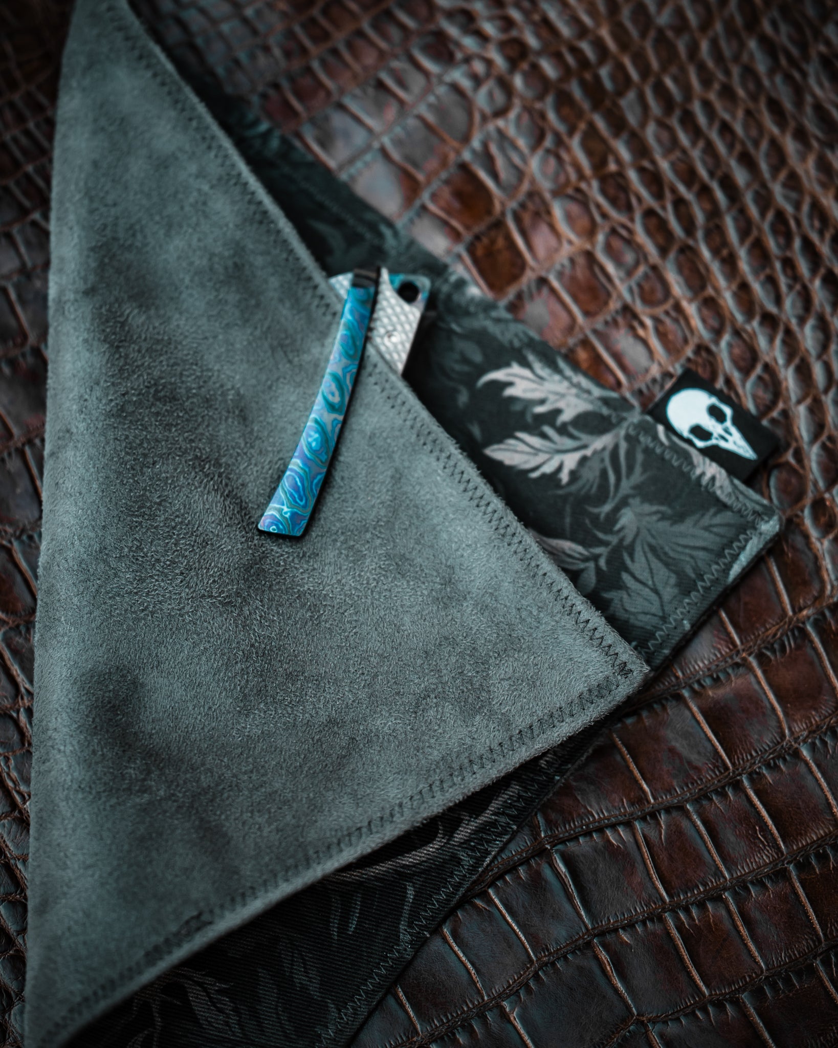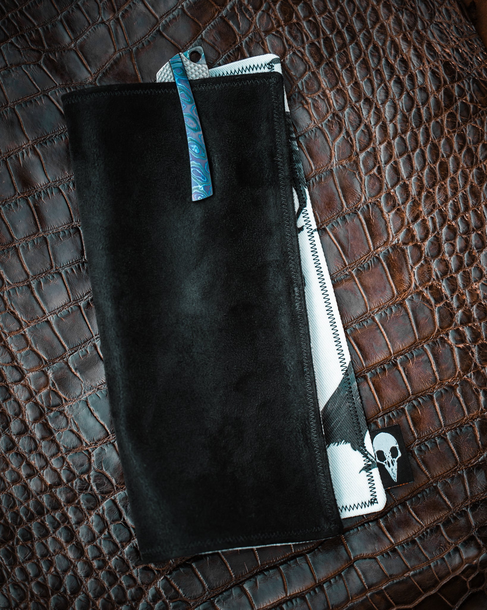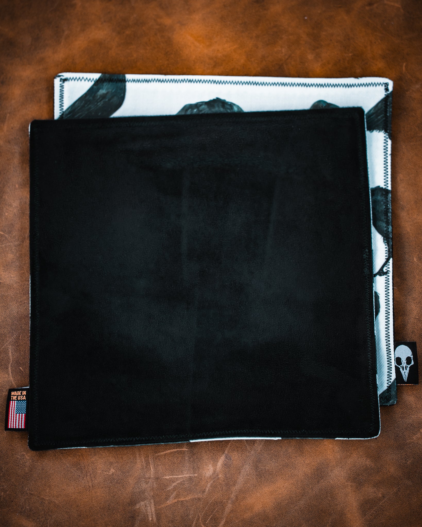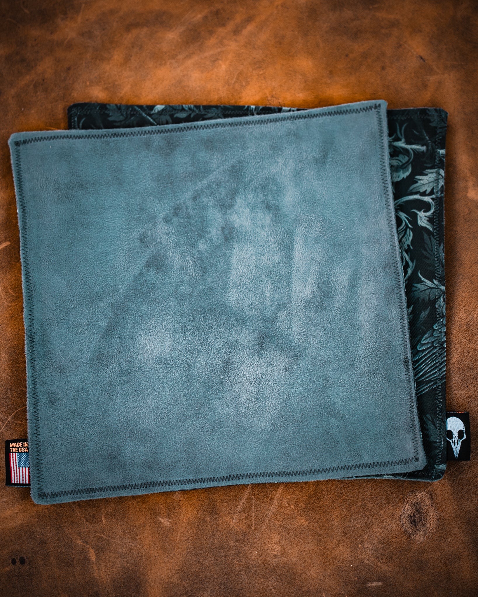 Does your eclectic knife collection attract fingerprints? Keep your goods clean and ready for show & tell with one of these handmade EDC hanks. Cotton twill on the decorated side, microsuede on the back side. 8 inches x 8 inches. Made in the USA.